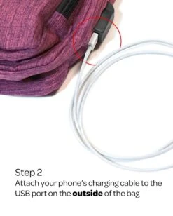 - There is a USB port located on the outside of the pack so that you can charge your phone while using it. Just place a portable power bank (not included) inside of the pack and connect it to the inside of the USB port. Now you can plug your phone into the external port and charge up without opening your bag.