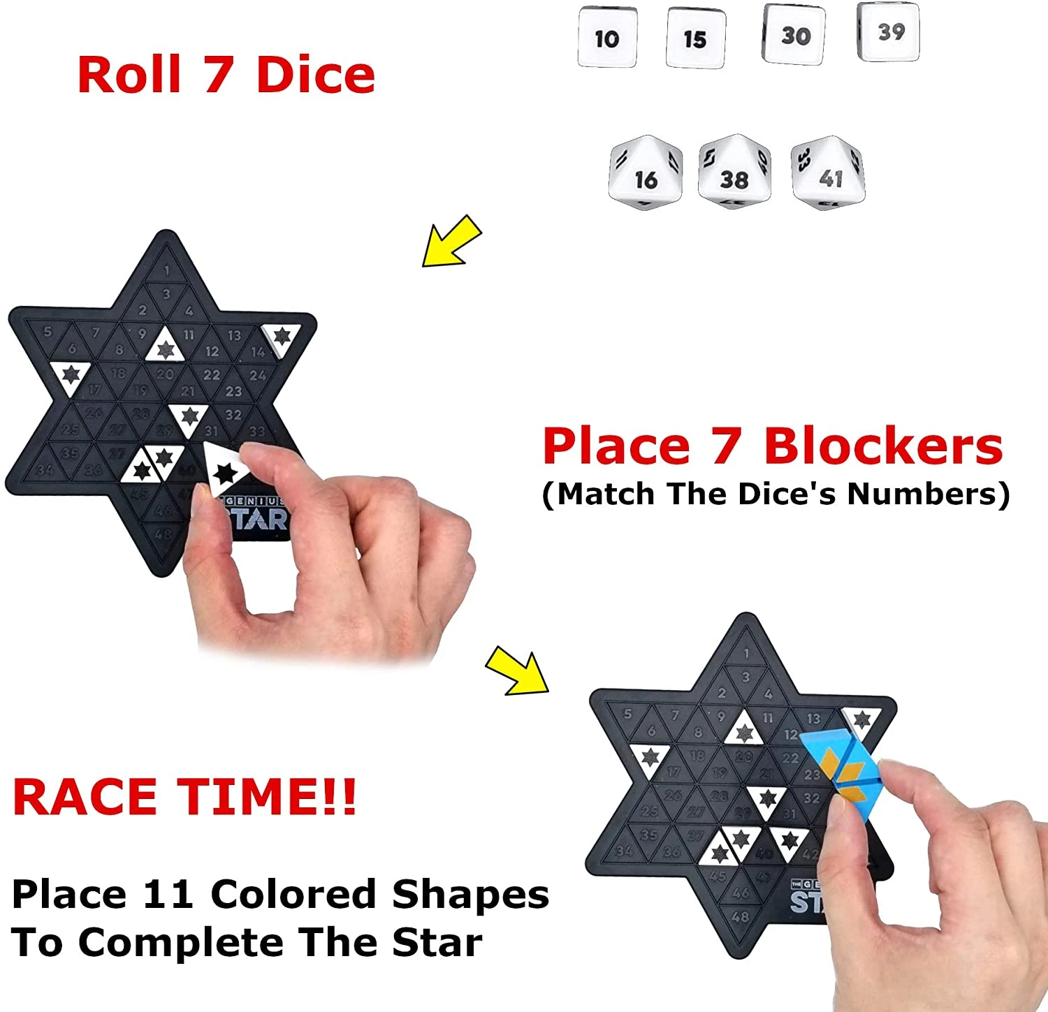 - 65, 000+ POSSIBILITIES IN THE BOX: The aim of the genius family game is to fill the 11 colored shapes in the 7 positioned blockers to complete a “STAR”. There are 165,888 possible solutions in the 48 triangle spaces grid. It is the advanced version of “The Genius Square”…. challenge yourself!