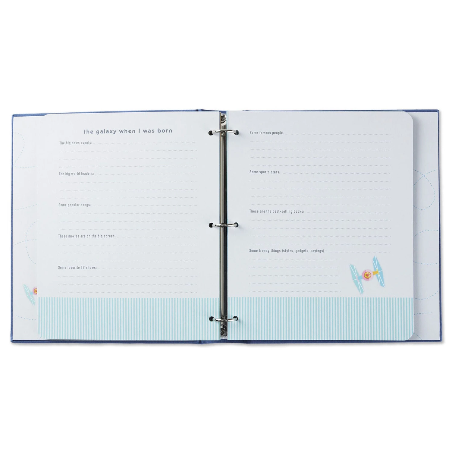 From their first giggles and coos to their first days in kindergarten, so much happens in a baby’s beginning years. Remember every treasured moment and epic milestone of your youngling’s first five years with this easy-to-use Star Wars baby memory book. The light blue cover features embroidered message with TIE fighter, X-Wing fighter and planets design.